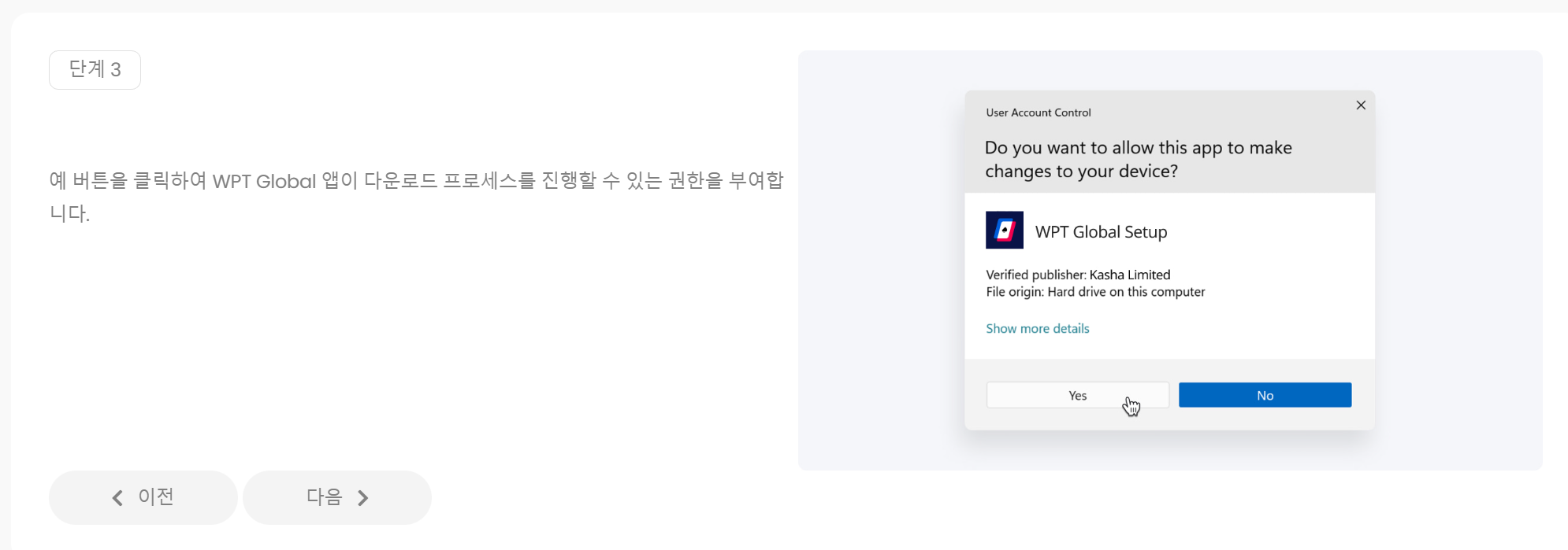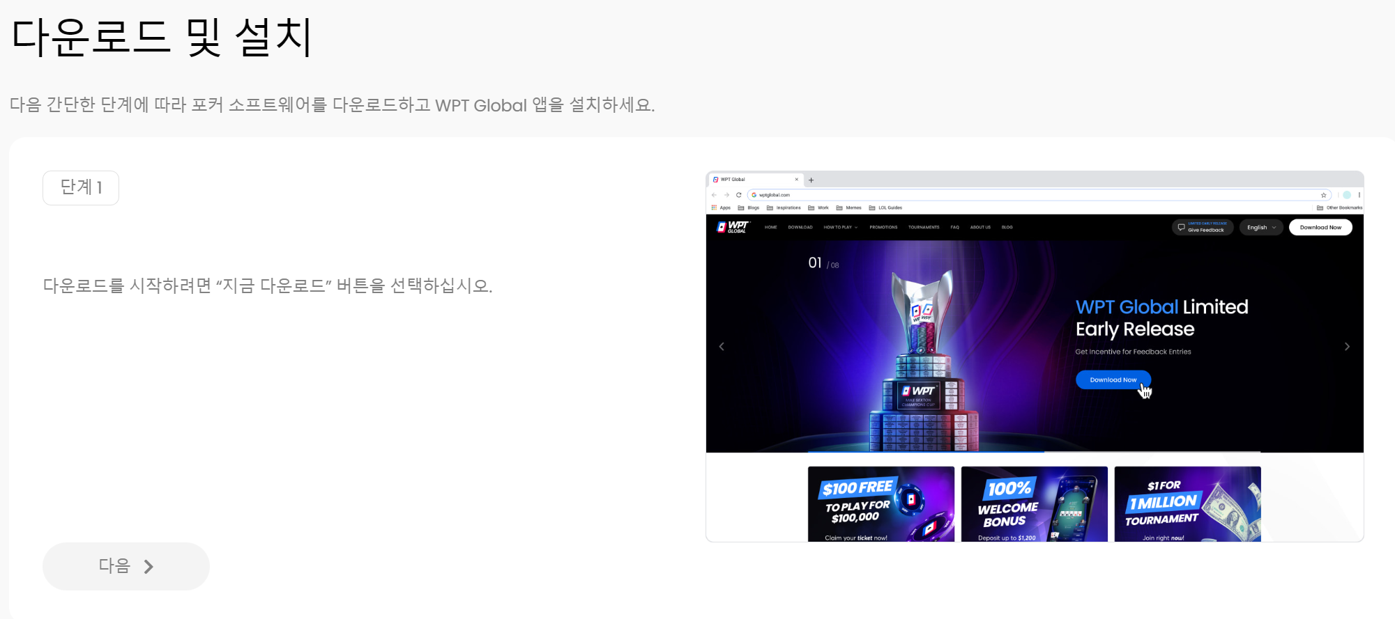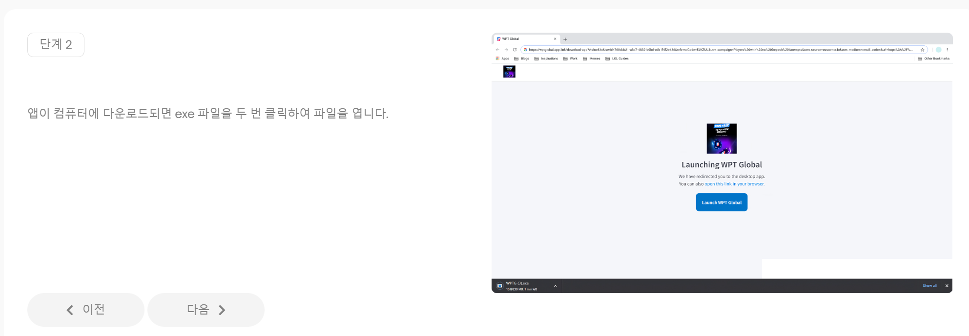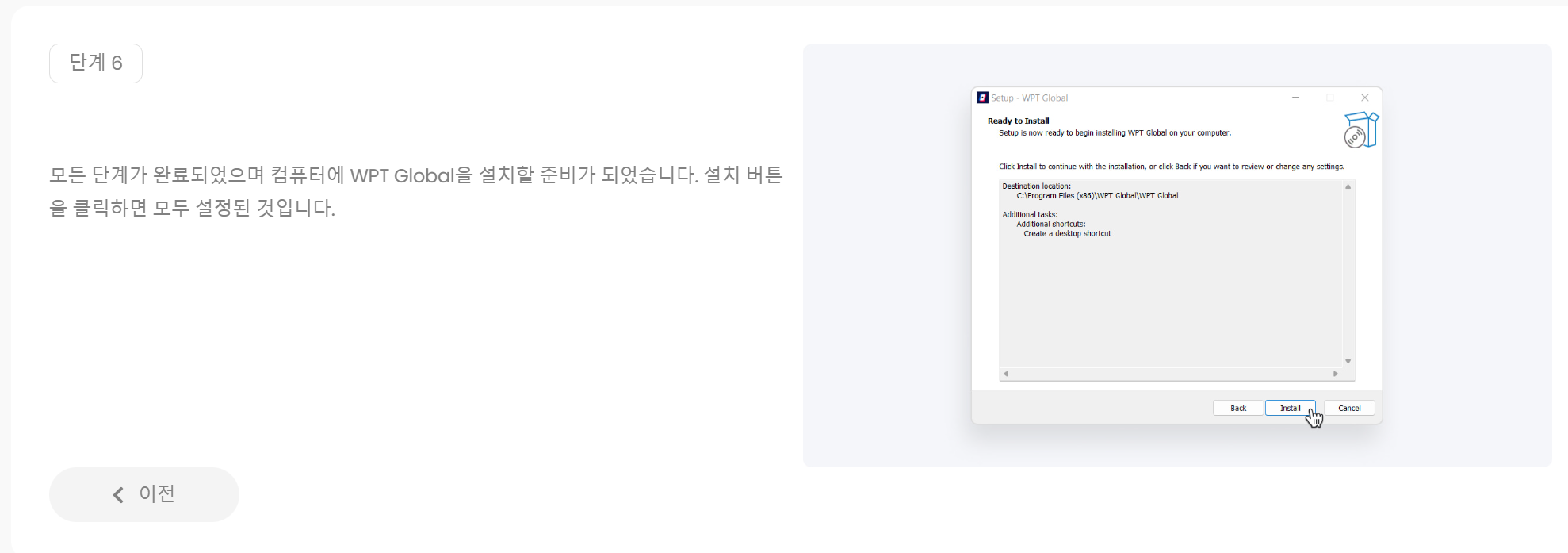 WPT Global 앱을 바탕화면에 설치할지를 설정하고 다음으로 넘어갑니다.