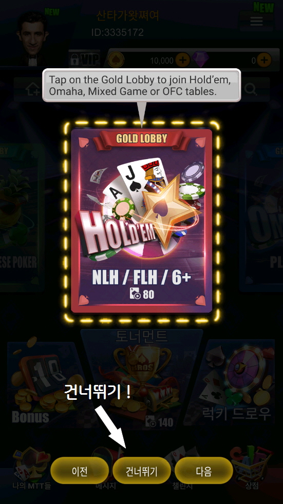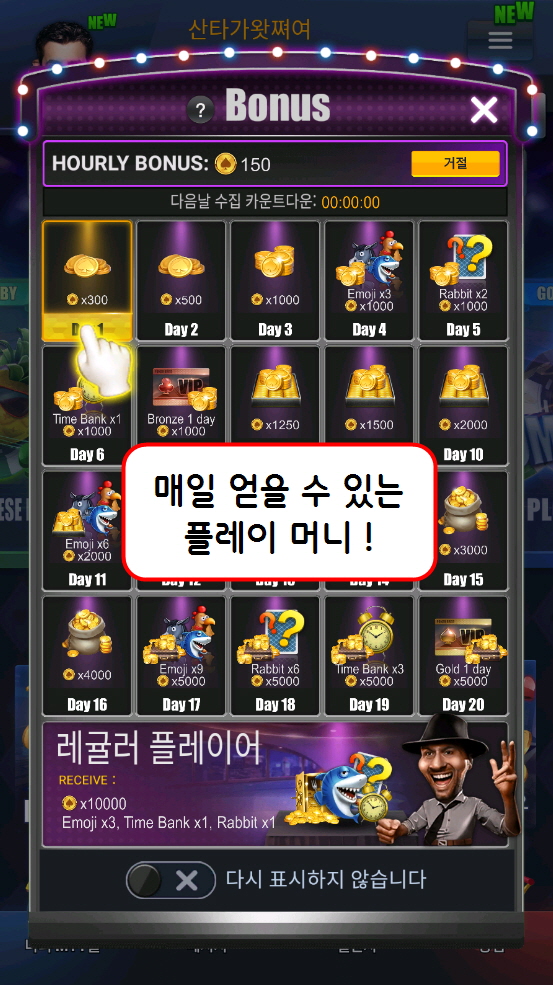 그럼 매일 받을 수 있는 플레이머니 화면과, 그냥 건너뛰기 하는 화면이 나옵니다.